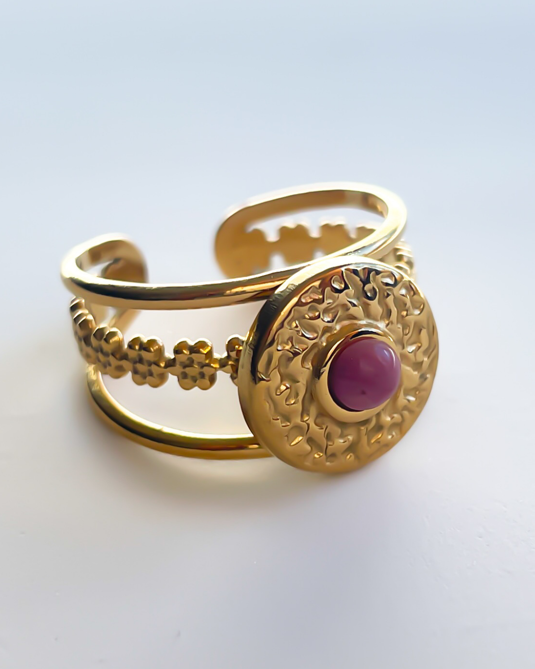 Bague dorée avec une perle rose. Succombez pour un look vintage et intemporel.