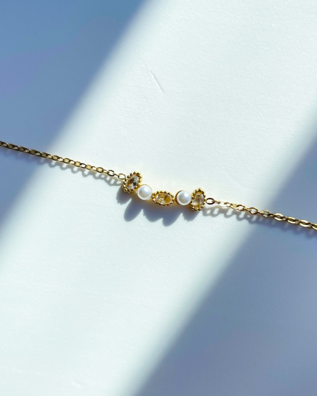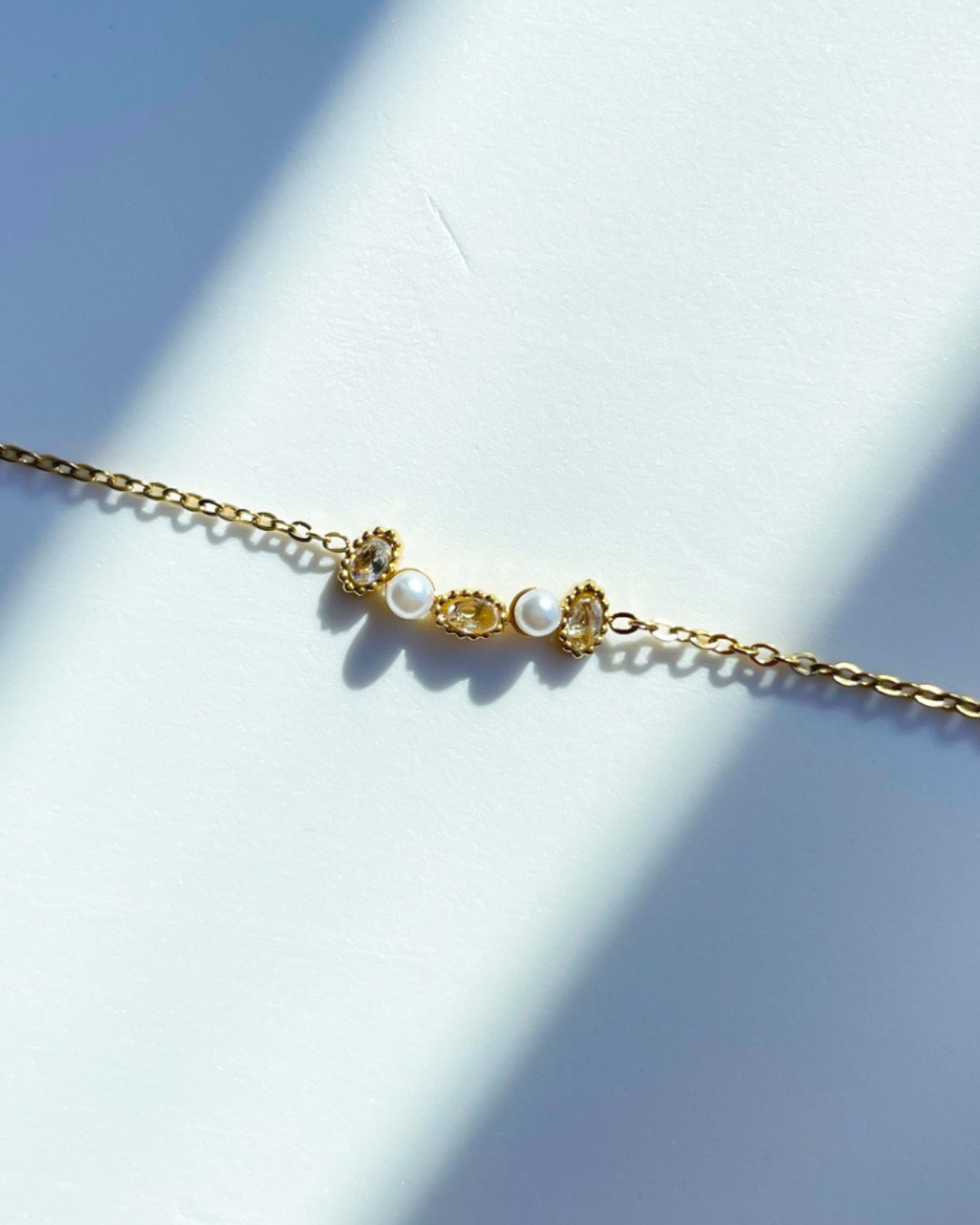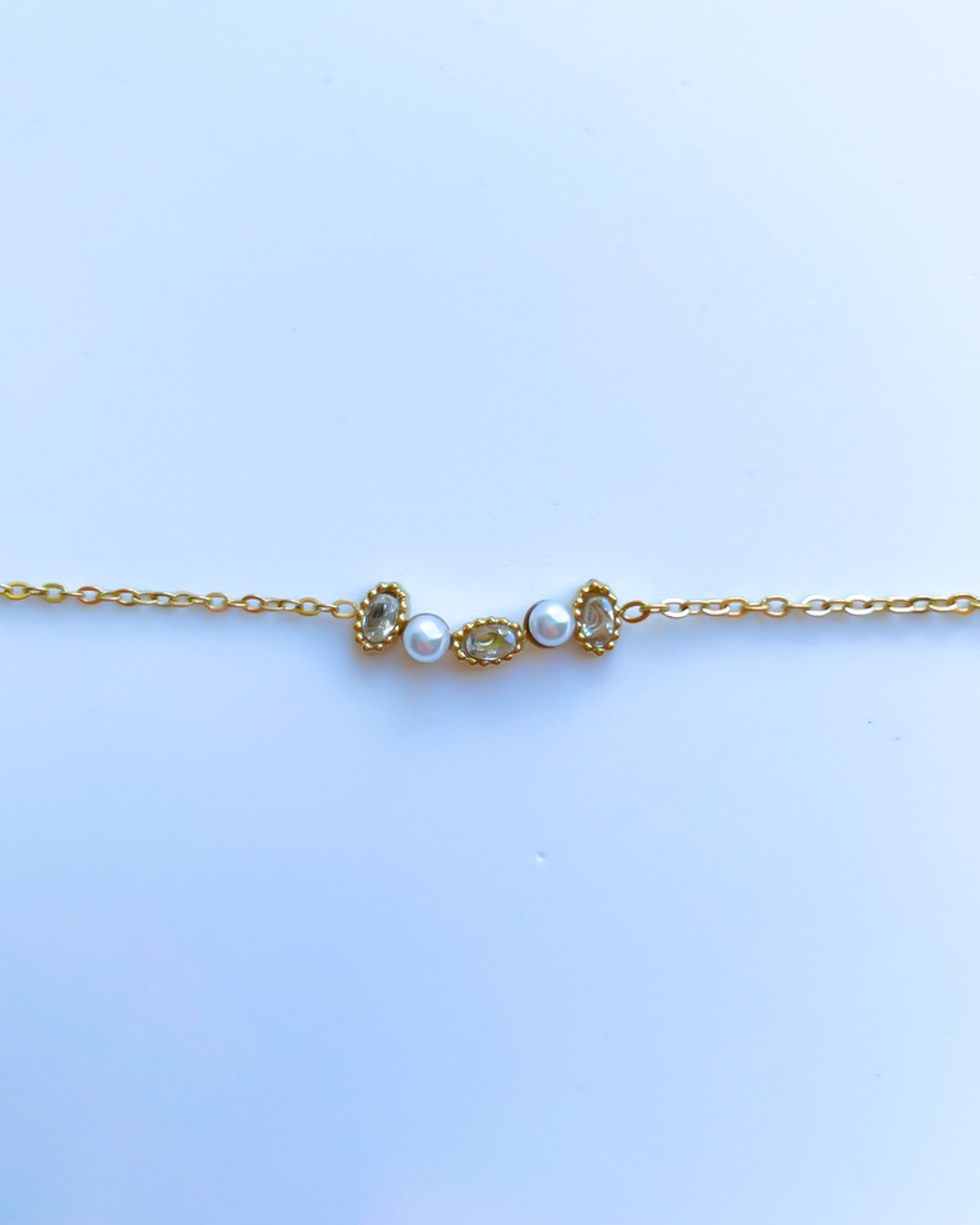 Bracelet doré et perle blanche nacrée.